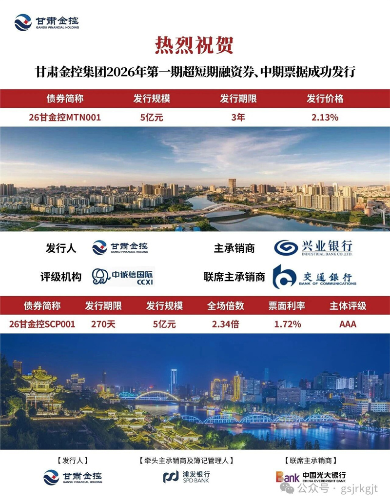 近日,甘肅金控集團成功發(fā)行2026年第一期超短期融資券,規(guī)模5億元,期限270天,票面利率1.72%,創(chuàng)集團債券發(fā)行利率歷史新低;同期成功發(fā)行2026年第一期中期票據(jù),發(fā)行規(guī)模5億元,期限3年,票面利率2.13%,刷新集團中期票據(jù)發(fā)行利率最低記錄。