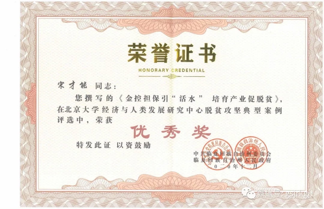 本次評選活動,共有845篇典型案例和15個視頻資料入圍,最終110個典型案例獲獎,金控臨夏擔保獲得表彰,是州委州政府對金控臨夏擔保扶貧工作的充分肯定,進一步激發了全體員工扎實工作,助力鄉村振興的工作熱情。
